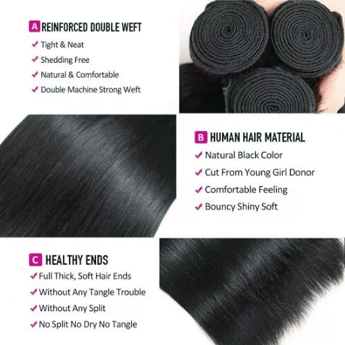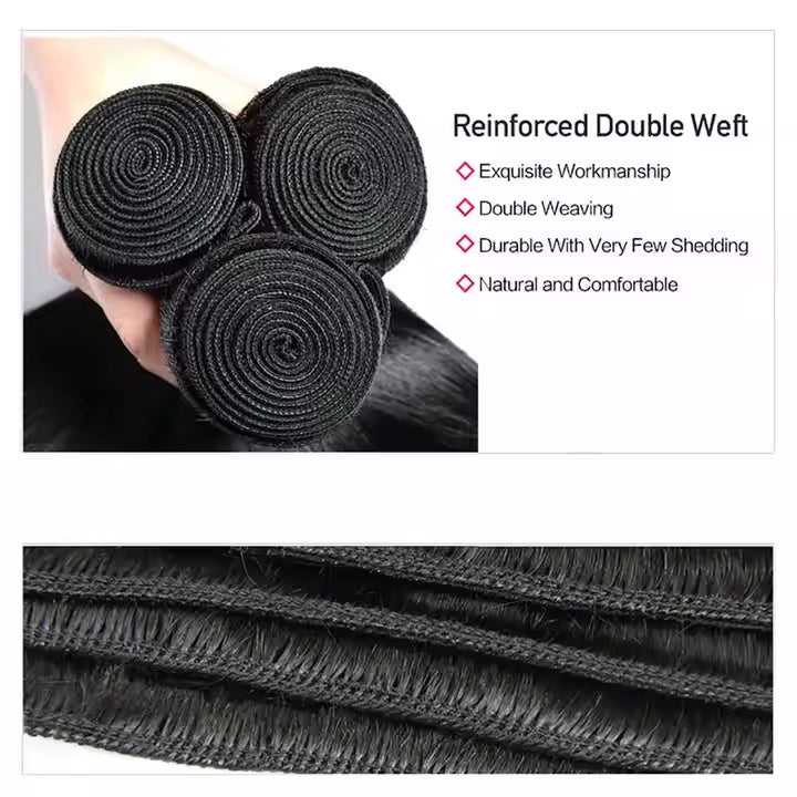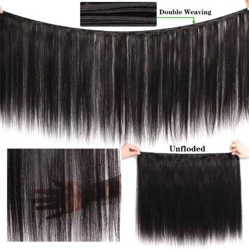 Experience luxury and fullness with our Double Drawn Straight Human Hair Bundles, made from 100% natural black virgin hair. Designed for those who desire thicker, fuller hair from root to tip, these Great -quality bundles provide a sleek, silky, and voluminous look. Each strand is carefully selected and double drawn to remove shorter hairs, ensuring uniform thickness and density. With a tangle-free and shedding-free finish, these 3 bundles (95g-100g each) deliver a smooth, natural appearance that blends seamlessly with your hair. Whether you want to add length, volume, or achieve a polished, elegant style, these bundles offer long-lasting beauty and versatility.