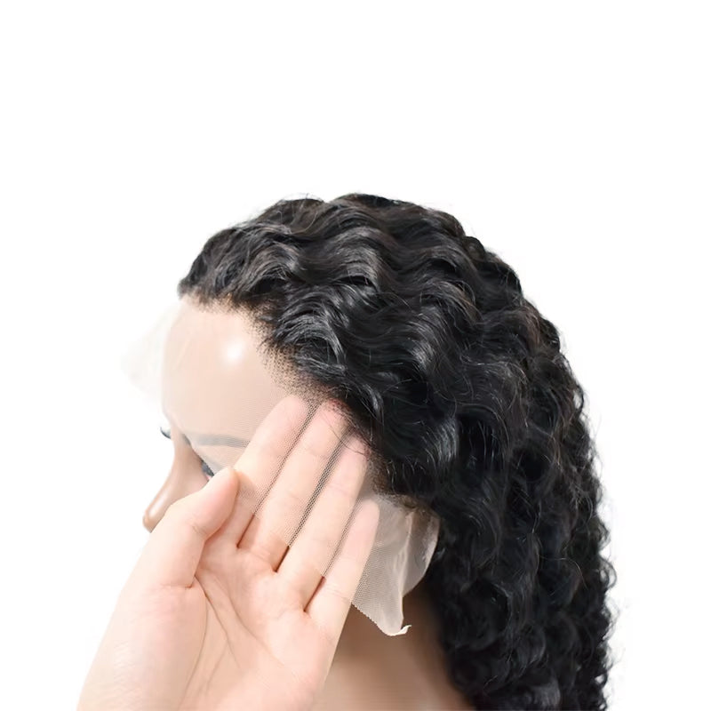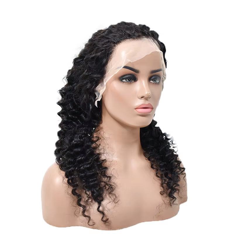 13x4 Lace Front Natural Black Deep Curly Human Hair Wig, designed to offer a flawless and natural appearance. Crafted from virgin human hair, this wig features a pre-plucked hairline with natural baby hairs, ensuring a realistic and seamless blend. The deep curly texture provides voluminous, bouncy curls that add elegance and charm to your look.