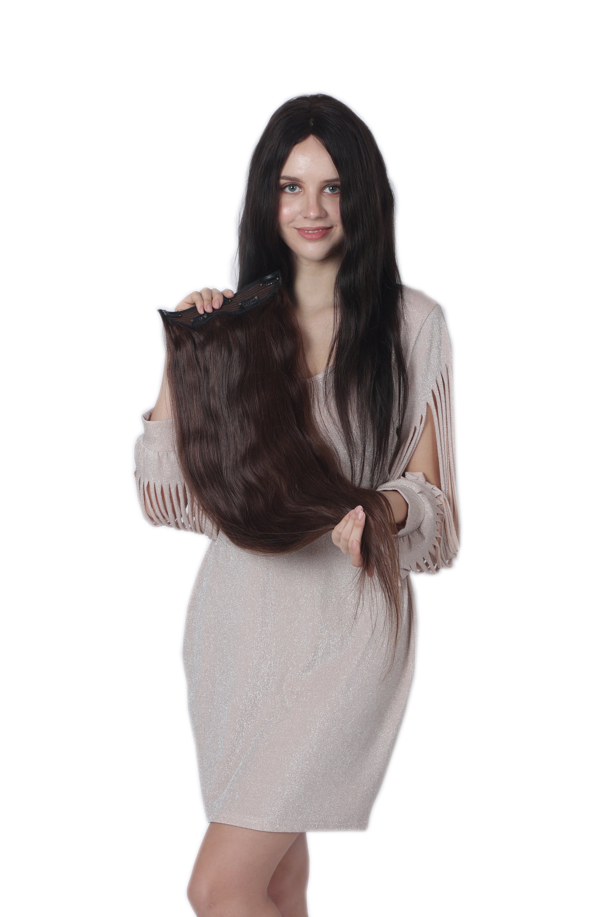 The Dark Brown shade of these clip-in hair extensions is versatile and timeless, allowing you to create various hairstyles for any occasion. Whether you're looking to add length, volume, or a touch of elegance to your hair, these extensions are designed to deliver outstanding results. The straight texture adds sleekness and sophistication to your overall look, enhancing your natural beauty effortlessly.