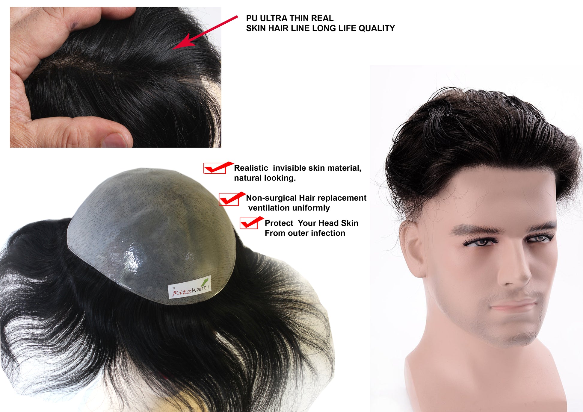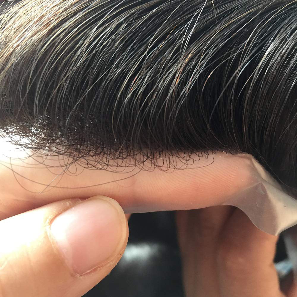 PU Ultra thin Human Hair Natural Black Straight Soft Hair toupee / Patches For Men
