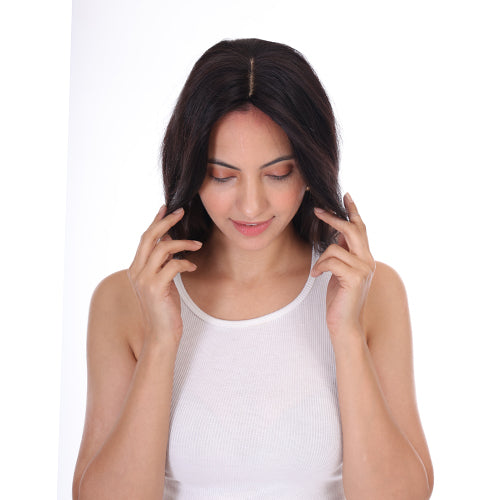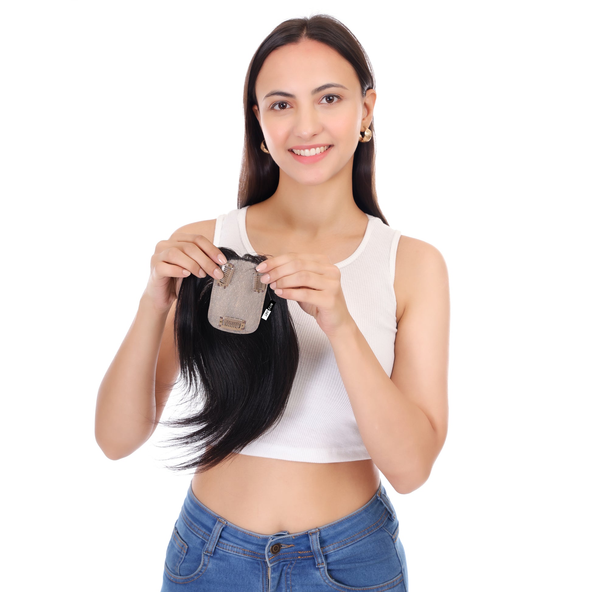 12 Inch Silk Base Top Hair Piece. This straight human hair topper features a sleek centre part design, making it a perfect choice for those seeking a natural and seamless blend with their existing hair. Crafted with high-quality black human hair, this clip-on topper adds volume and length while maintaining a lightweight and comfortable fit. Ideal for daily wear or special occasions, the Ritzkart hair topper ensures you step out with confidence and style.