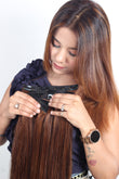 - Clip In the Extensions: Open the clips on the hair extensions and attach them close to the roots of your parted hair. Snap the clips shut to secure them in place.