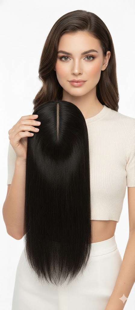 Ritzkart Hair Topper for Women – Dark Brown Synthetic Fiber Straight Topper, 5x5 Inch Base, Clip-On with Middle Part, 20 Inch Long, Lightweight Matte Finish, Natural Look Hair Extension for Thinning Hair & Grey/White Coverage (4 Clips)